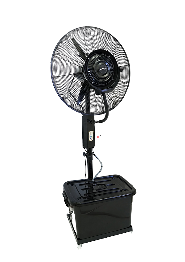 زمانی که دستگاه روشن میشود، موتور پروانه را به حرکت درمیآورد و جریان هوای شدیدی به جلو پرتاب میشود. همزمان، آب از مخزن توسط پمپ به نازلها ارسال شده و به صورت ذرات بسیار ریز به هوا پاشیده میشود. این ذرات در مجاورت هوای گرم محیط تبخیر شده و انرژی گرمایی محیط را جذب میکنند. در نتیجه، دمای هوا به طور محسوسی کاهش مییابد.