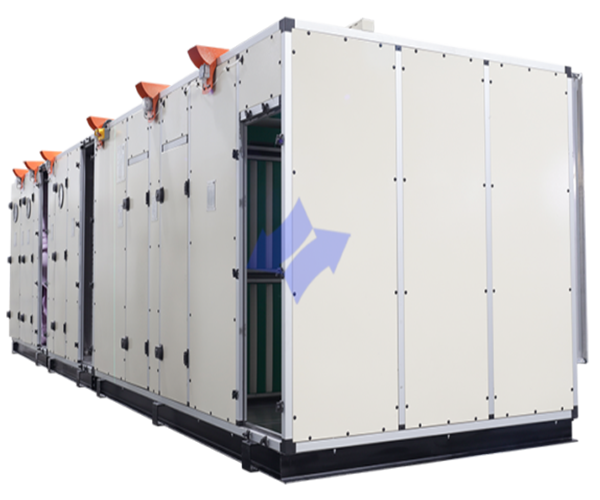 The air handling units are constructed in a fully enclosed structure with low leakage, consisting of mechanical and electronic equipment. Their duties include filtration, air circulation, positive pressure, and providing heating, cooling, and humidity control.